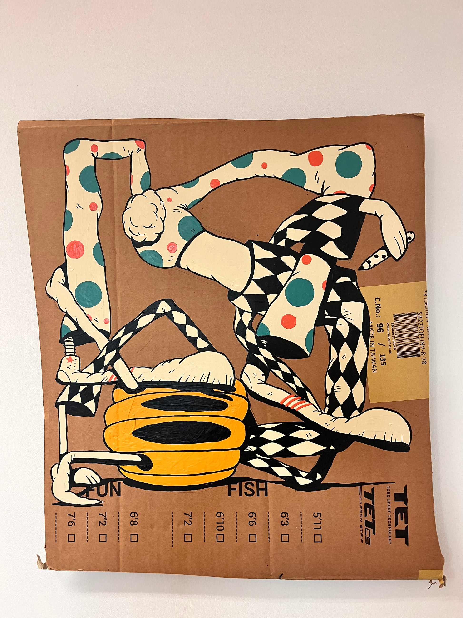 Unique hand painted figure on cardboard.